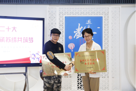 在有关领导及50多名师生代表的见证下,陆伟校长和苏州市古吴绣皇工艺有限公司沈德龙大师互赠了苏绣文化艺术传承教育基地和苏绣文化艺术辅导教育基地铜牌。